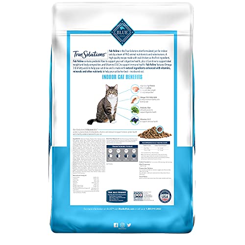 Details: BLUE True Solutions Fab Feline dry cat food is specially formulated for indoor cats with high-quality protein and L-Carnitine to support lean muscles, ideal weight and body composition, plus prebiotic fiber, clinically proven to support digestive health. Made with the finest natural ingredients enhanced with vitamins, minerals and other nutrients, this delicious indoor cat food includes antioxidant-rich LifeSource Bits, plus Omega 3 & 6 fatty acids to support healthy skin and a shiny coat.