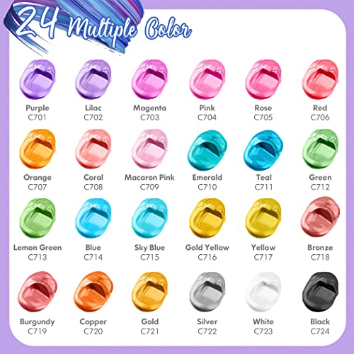 - This art acrylic painting kit comes with 24-pack, 2 oz / 59ml bottles in the Meatllic colors: Purple, Lilac, Magenta, Pink, Rose, Red, Orange, Coral, Macaron Pink, Emerald, Teal, Green, Lemon Green, Blue, Sky Blue, Gold Yellow, Yellow, Bronze, Burgundy, Copper, Gold, Silver, White, Black.