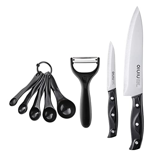 - 5. WHAT YOU GET: 8″ chef’s knife, 4″ paring knife, 5 measuring spoon and vegetable peeler. Knives set for kitchen is an ideal gift of choice for your friends, family and even professional chef.
