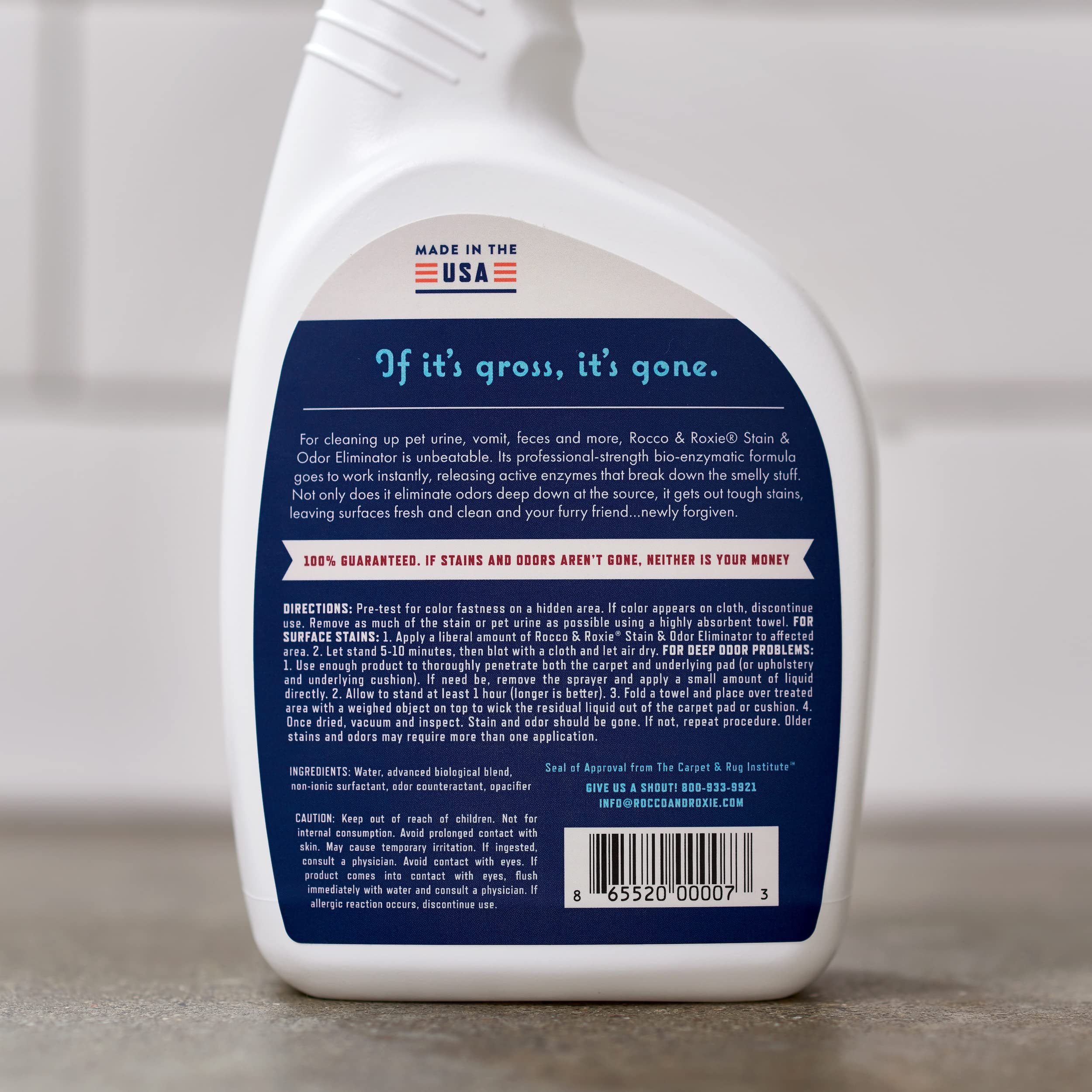 Details: Accidents happen. After all, dogs are only canine. And even the best-behaved cats sometimes think outside the litter box. That’s when it’s up to us, as their true best friends, to have the right product on hand to restore peace, love and carpets. In the case of pet urine and other tough stains and odors, Rocco & Roxie stain & odor eliminator is the one to reach for. Its professional-strength bio-enzymatic formula goes to work at once, releasing active bacteria that feed on ammonia residues left behind in pet urine and other organic materials. So not only does it get out the stain, it eliminates the odor deep down within the carpet at its source-which discourages re-soiling. The result: Stains and odors are completely eliminated, leaving carpets, floors, furniture and other surfaces fresh and your beloved pet. Out of the dog house. Of course, it works on much more than pet urine: any organic stain-vomit, feces, all the gross stuff, whether human or animal-lifts out of rugs, carpets and upholstery easily and completely. And not only is our stain & odor eliminator child, pet, it’s so safe on carpets its earned approval from the trusted carpet and rug institute (CRI). Many of our customers tell us this is the most effective stain and odor product they’ve ever used — in fact, we guarantee it! Not just the stain, but the stink. From stinky yellow pet urine and feces to vomit and other organic spills, our professional strength formula tackles them all.